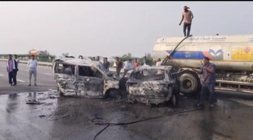 10 / दिसंबर / 2025 : बाराबंकी में एक दर्दनाक हादसा हुआ है, जहां पूर्वांचल एक्सप्रेसवे पर दो कारों की टक्कर के बाद आग लग गई, जिसमें पांच लोगों की मौके पर ही मौत हो गई। मृतकों में दो महिलाएं और तीन बच्चे शामिल हैं। हादसे में घायल हुए चार लोगों को हैदरगढ़ सीएचसी में भर्ती कराया गया है, जहां उनकी हालत गंभीर बनी हुई है। हादसा बुधवार को डीह गांव के पास हुआ, जब एक वैगन आर कार सड़क किनारे खड़ी थी और पीछे से आ रही ब्रेजा कार ने उसे टक्कर मार दी। टक्कर इतनी जोरदार थी कि दोनों कारें आग की लपटों में घिर गईं। पुलिस और फायर ब्रिगेड की टीम ने मौके पर पहुंचकर, आग पर काबू पाया गया। मुख्यमंत्री योगी आदित्यनाथ ने हादसे का संज्ञान लिया और अधिकारियों को तत्काल मौके पर पहुंचकर राहत कार्य में तेजी लाने के निर्देश दिए। उन्होंने घायलों के समुचित उपचार के भी निर्देश दिए।
